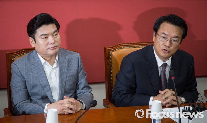 (서울=포커스뉴스) 정진석 새누리당 원내대표가 20일 오전 서울 여의도 국회에서 열린 원내지도부-중진의원 연석회의에 참석해 모두발언을 하고 있다. 왼쪽은 원유철 전 원내대표.
