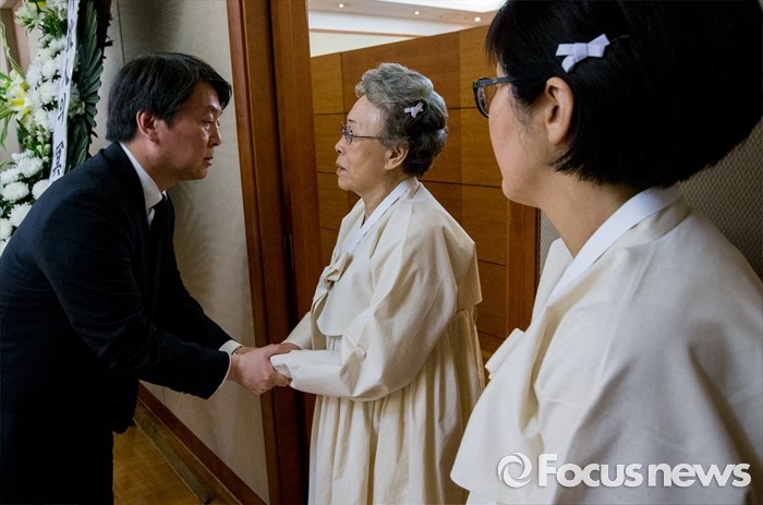 (서울=포커스뉴스) 20일 오전 서울 송파구 아산병원 장례식장에 마련된 故 김재순 전 국회의장의 빈소를 찾은 안철수 국민의당 상임공동대표가 조문을 마친 후 김 전 의장의 부인 이용자씨를 위로하고 있다.