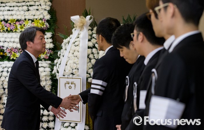 (서울=포커스뉴스) 20일 오전 서울 송파구 아산병원 장례식장에 마련된 故 김재순 전 국회의장의 빈소를 찾은 안철수 국민의당 상임공동대표가 조문을 마친 후 유가족들을 위로하고 있다.