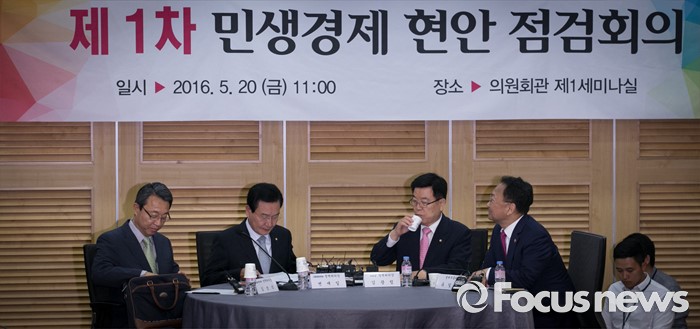 (서울=포커스뉴스) 20일 오전 서울 여의도 국회 의원회관에서 열린 1차 민생경제현안점검회의에 참석한 3당 정책위의장과 유일호 경제부총리 겸 기획재정부 장관이 논의를 하고 있다. 왼쪽부터 김성식 국민의당 정책위의장, 변재일 더불어민주당 정책위의장, 김광림 새누리당 정책위의장, 유 부총리.