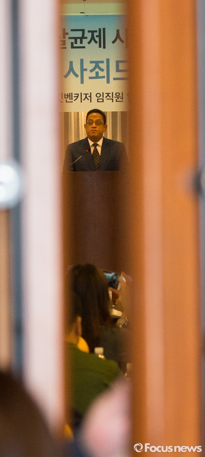 (대전=포커스뉴스) 아타 사프달 옥시레킷벤키저 대표와 임원진이 20일 오후 대전 유성구 아드리아호텔에서 옥시의 가습기 살균제 제품 피해자와 면담을 하고 있다.