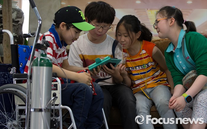 (대전=포커스뉴스) 아타 사프달 옥시레킷벤키저 대표와 임원진이 20일 오후 대전 유성구 아드리아호텔에서 옥시의 가습기 살균제 제품 피해자와 면담을 마련한 가운데 피해 어린이들이 핸드폰 게임을 하고 있다.