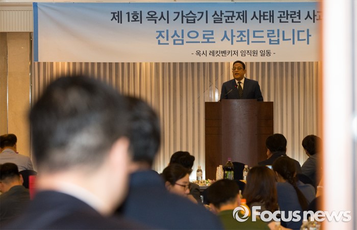 (대전=포커스뉴스) 아타 사프달 옥시레킷벤키저 대표와 임원진이 20일 오후 대전 유성구 아드리아호텔에서 옥시의 가습기 살균제 제품 피해자와 면담을 하고 있다.