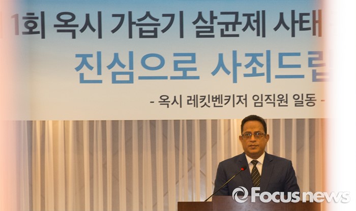 (대전=포커스뉴스) 아타 사프달 옥시레킷벤키저 대표와 임원진이 20일 오후 대전 유성구 아드리아호텔에서 옥시의 가습기 살균제 제품 피해자와 면담을 하고 있다.
