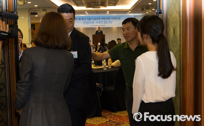 (대전=포커스뉴스) 아타 사프달 옥시레킷벤키저 대표와 임원진이 20일 오후 대전 유성구 아드리아호텔에서 옥시의 가습기 살균제 제품 피해자와 면담을 마련한 가운데 피해자들이 면담장으로 입장하고 있다.