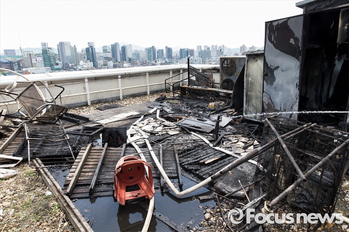 (서울=포커스뉴스) 20일 오후 서울 강남구 압구정의 한 영화관 건물 옥상에서 발생한 화재의 흔적이 남아있다. 이 불로 다친사람은 없지만 영화관에 있던 관람객들이 놀라 대피하는 소동이 벌어졌다. 소방당국은 냉각탑에서 불이 시작된 것으로 보고 정확한 화재 원인을 조사하고 있다.