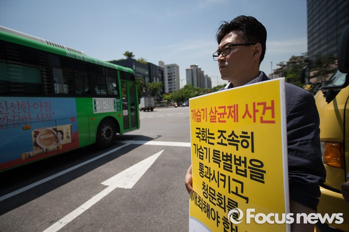 (서울=포커스뉴스) 20일 오전 서울 여의도역 사거리 앞에서 열린 가습기 살균제 참사 관련 대국민 캠페인 선포식에서 한 참석자가 가습기 살균제 진상 규명을 촉구하는 피켓을 들고 있다.