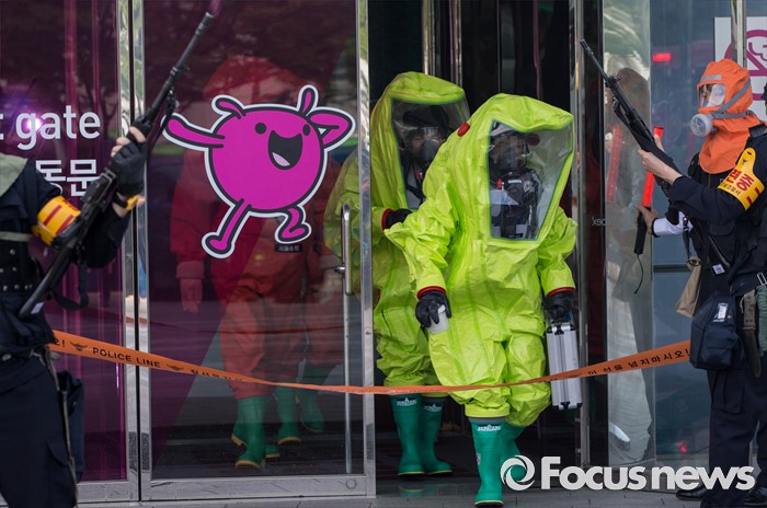 (서울=포커스뉴스) 20일 오후 서울 강남구 코엑스에서 열린 '2016 재난대응 안전한국훈련'에 참여한 훈련병력들이 테러대응훈련을 펼치고 있다.