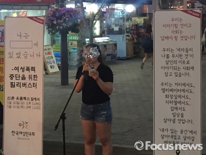 한국여성민우회는 20일 서울 서대문구 신촌에서 '여성폭력 중단을 위한 필리버스터'를 열고 남성들로부터 겪은 폭력과 희롱에 대한 경험을 털어놓는 자리를 마련했다.