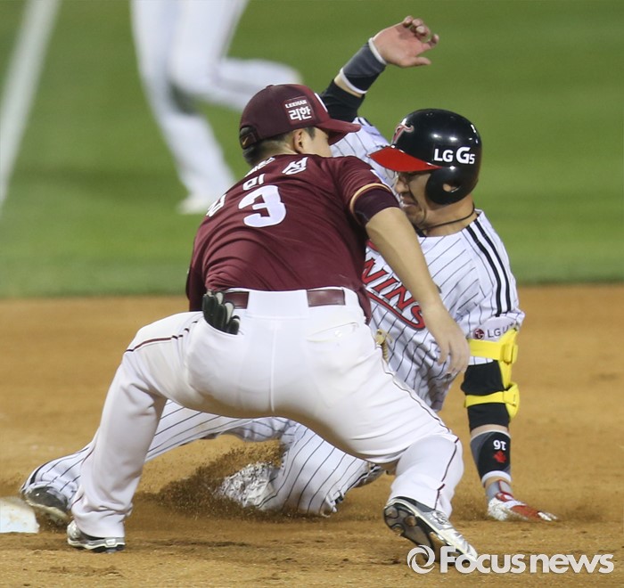 (서울=포커스뉴스) 20일 서울 잠실구장에서 열린 2016 프로야구 넥센-LG 경기 8회말 1사 3루에서 LG 정성훈이 우익수를 넘기는 타구를 날리고 3루에서 세이프되고 있다.