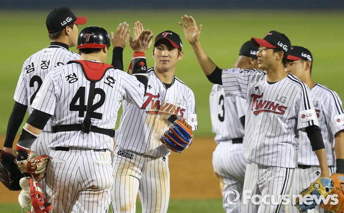 (서울=포커스뉴스) 20일 서울 잠실구장에서 열린 2016 프로야구 넥센-LG 경기에서 역전승한 LG 선수들이 마운드에 모여 하이파이브하며 승리의 기쁨을 나누고 있다.