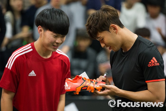 (서울=포커스뉴스) 손흥민이 20일 오후 서울 용산구 아이파크몰 풋살경기장에서 열린 아디다스 손흥민 팬미팅 및 사인회에서 팬에게 줄 축구화에 사인을 하고 있다.