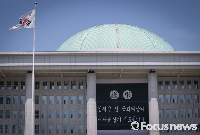김종인 더민주 대표는 "그동안 의회에 많은 족적을 남긴 분"이라고 말했다. 안철수 국민의당 대표는 "그분이 말씀하신 소통과 협치의 정치를 하겠다"고 다짐했다.20일 오전 서울 여의도 국회 본청에 지난 17일 별세한 김재순 전 국회의장을 추모하는 현수막이 걸려 있다. 2016.05.20 박동욱 기자