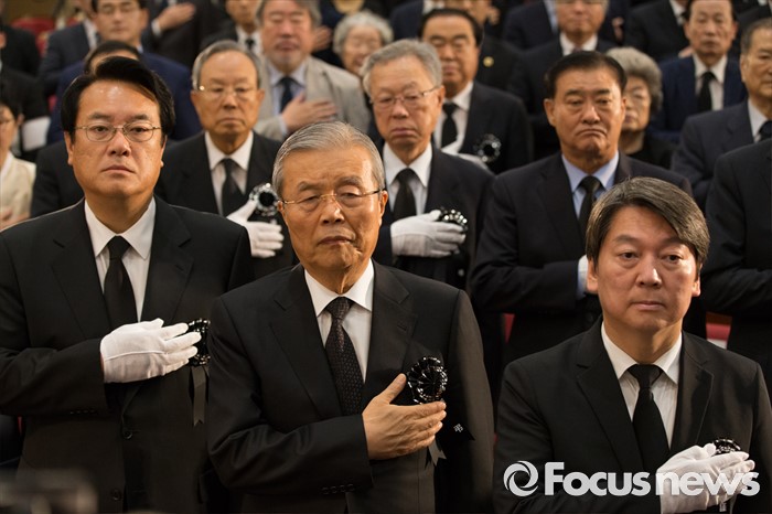 (서울=포커스뉴스) 21일 오전 서울 여의도 국회에서 엄수된 故 김재순 전 국회의장 국회장 영결식에 정진석(왼쪽부터) 새누리당 원내대표와 김종인 비대위 대표, 안철수 국민의당 상임공동대표가 참석해 국민의례를 하고 있다.
