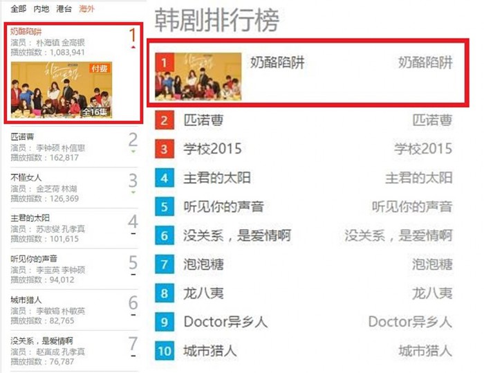 지난 19일부터 중국 동영상 사이트 유쿠에서 방영을 시작한 tvN'치즈인더트랩'은 유쿠 한국 드라마 인기 검색 순위 1위를 차지하며 21일 오후 2시 현재 첫 회 조회수가 500만을 넘어섰다.
