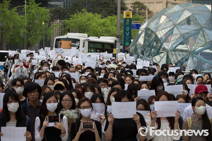 (서울=포커스뉴스) 21일 오후 서울 서초구 강남역 10번 출구 인근에서 시민들이 '강남역 여성혐오 살인사건 추모 집회'에 참석해 행진을 마친 뒤 피켓을 들고 있다.