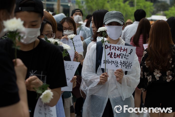 (서울=포커스뉴스) 21일 오후 서울 서초구 강남역 10번 출구 인근에서 시민들이 '강남역 여성혐오 살인사건 추모 집회'에 참석해 행진을 준비하고 있다.