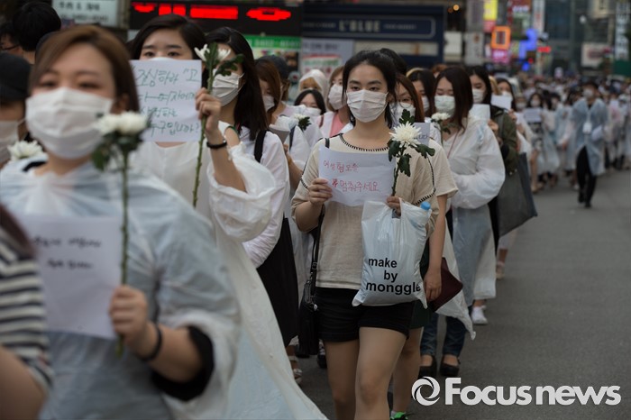 (서울=포커스뉴스) 21일 오후 서울 서초구 강남역 10번 출구 인근에서 시민들이 '강남역 여성혐오 살인사건 추모 집회'에 참석해 행진하고 있다.