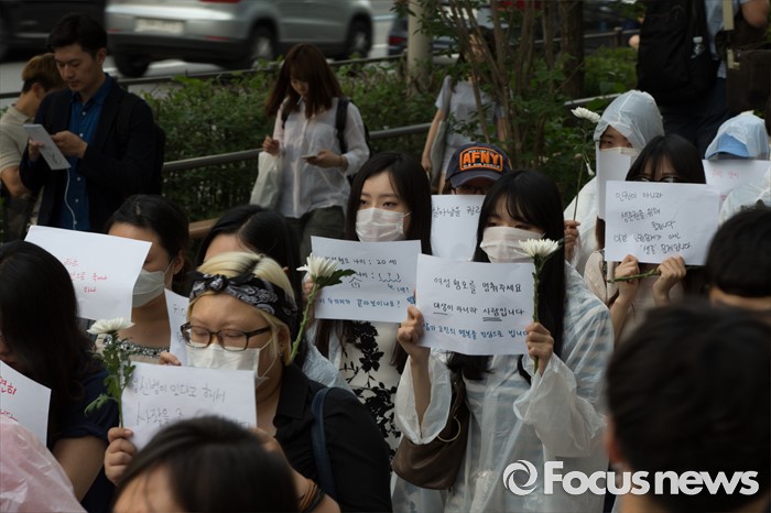 (서울=포커스뉴스) 21일 오후 서울 서초구 강남역 10번 출구 인근에서 시민들이 '강남역 여성혐오 살인사건 추모 집회'에 참석해 행진하고 있다.