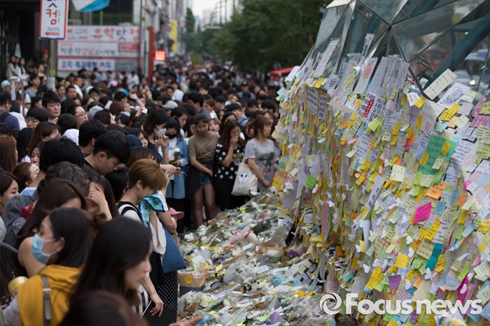 건서울=포커스뉴스) 21일 오후 서울 서초구 강남역 10번 출구에서 시민들이 '강남 묻지마 살인사건' 피해자를 추모하고 있다.