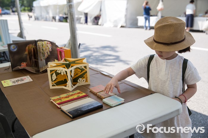 (서울=포커스뉴스) 22일 오전 서울 여의도 국회 잔디마당에서 열린 '2016 열린국회마당' 축제에서 한 어린이가 북 페스티벌 부스에서 책을 만지고 있다.