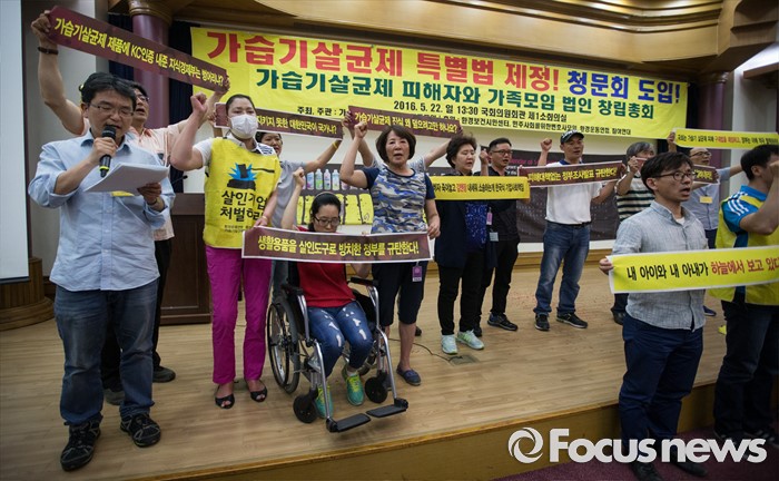 (서울=포커스뉴스) 가습기살균제 피해자와 가족모임(가피모)이 22일 오후 서울 영등포구 국회의원회관에서 열린 '2016 가습기살균제피해자 및 가족모임 법인창립총회'에서 특별법 재정과 책임자 처벌을 촉구하고 있다.