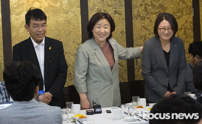 (서울=포커스뉴스) 심상정(가운데) 정의당 대표가 22일 오후 서울 여의도의 한 중식당에서 열린 기자간담회에서 추혜선 당선인(오른쪽)과 김종대 당선인을 소개하고 있다.