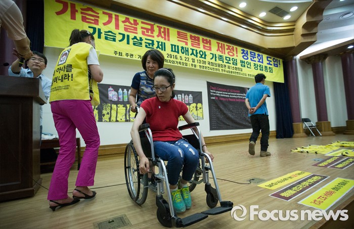 (서울=포커스뉴스) 삼성전자 LCD 공장에서 일하다 뇌종양을 앓게 된 한혜경씨와 그의 어머니가 22일 오후 서울 영등포구 국회의원회관에서 열린 '2016 가습기살균제피해자 및 가족모임 법인창립총회'에 참석하고 있다.