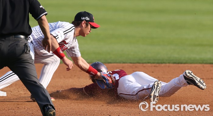 (서울=포커스뉴스) 22일 서울 잠실구장에서 열린 2016 프로야구 넥센-LG 경기 3회초 중전 안타로 진루한 넥센 김하성이 임병욱 타석때 2루 도루를 시도하다 LG 유격수 오지환에게 태그 아웃되고 있다.