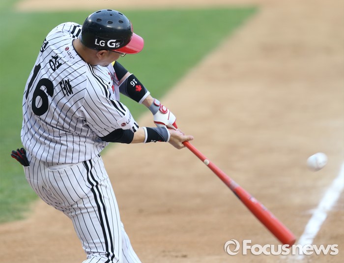 (서울=포커스뉴스) 22일 서울 잠실구장에서 열린 2016 프로야구 넥센-LG 경기 7회말 LG 대타 정성훈이 우전 안타를 날리고 있다.