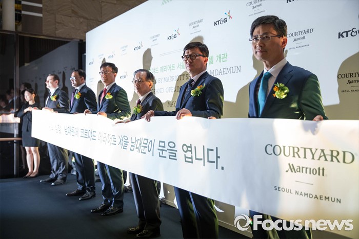 (서울=포커스뉴스) 23일 오전 서울 중구 코트야드 메리어트 서울 남대문 호텔에서 내빈들이 참석한 가운데 개관식이 열리고 있다. 왼쪽부터 폴 캐닝스 코트야드 메리어트 서울 남대문 총지배인, 라지브 메논 메리어트 인터내셔널 최고운영책임자, 백복인 KT&G 사장, 최경원 사외이사, 김용필 노조위원장, 김흥렬 부사장.