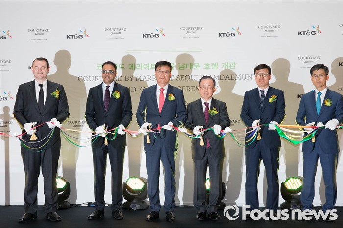 (서울=포커스뉴스) 23일 오전 서울 중구 코트야드 메리어트 서울 남대문 호텔에서 내빈들이 참석한 가운데 개관식이 열리고 있다. 왼쪽부터 폴 캐닝스 코트야드 메리어트 서울 남대문 총지배인, 라지브 메논 메리어트 인터내셔널 최고운영책임자, 백복인 KT&G 사장, 최경원 사외이사, 김용필 노조위원장, 김흥렬 부사장.