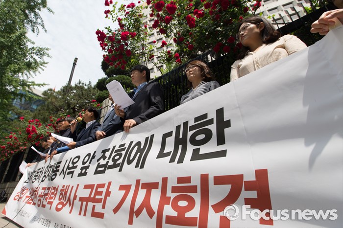 (서울=포커스뉴스) 민주사회를 위한 변호사모임 소속 변호사들과 엄기한 전국금속노조 유성기업지회 대외협력부장이 23일 오전 서울 종로구 서울지방경찰청 앞에서 현대자동차 양재동 사옥 앞 집회에 대한 경찰의 위법한 공권력 행사 규탄 기자회견을 하고 있다.