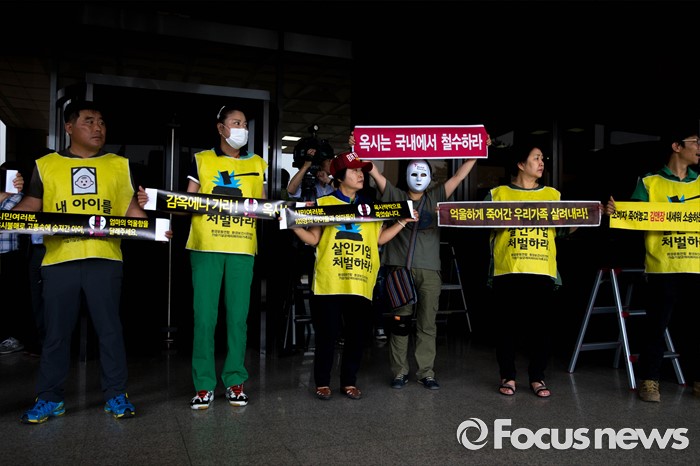 (서울=포커스뉴스) 23일 오전 서울 서초구 서울 중앙지검 앞에서 살균제 피해자와 가족모임 관계자들이 존 리 옥시 레킷벤키저 전 대표 검찰 소환조사를 기다리며 손 피켓을 들고 있다.