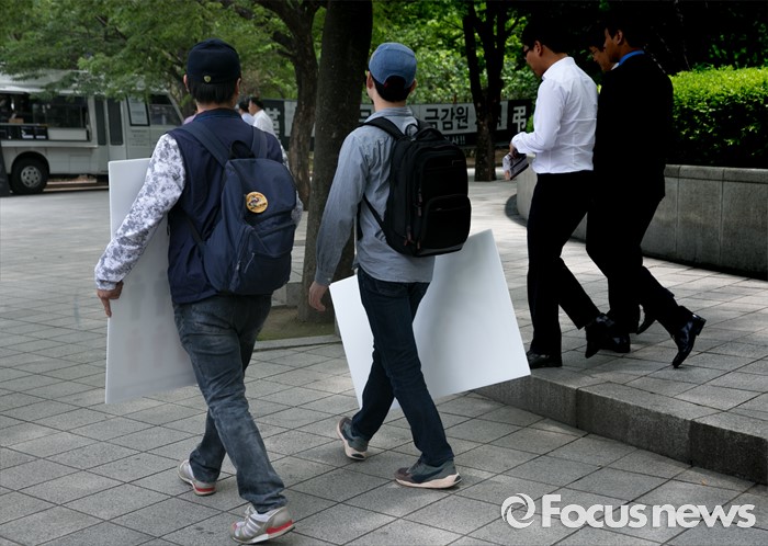(서울=포커스뉴스) 23일 오전 서울 여의도 전국경제인연합회 앞에서 민주노총과 시민사회단체 등으로 구성된 재벌책임공동행동이 전경련 규탄 및 서울대행진 출발 기자회견을 마친 뒤 산업은행으로 이동하고 있다.