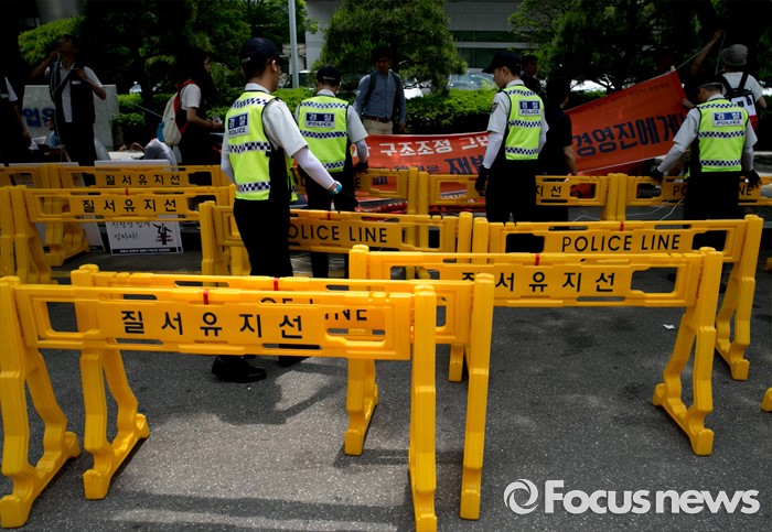 (서울=포커스뉴스) 23일 오후 서울 여의도 산업은행 본점 앞에서 민주노총과 시민사회단체 등으로 구성된 재벌책임공동행동이 규탄 및 서울대행진 출발 기자회견을 준비하고 있는 동안 경찰 병력이 시민들을 위한 질서유지선을 설치하고 있다.