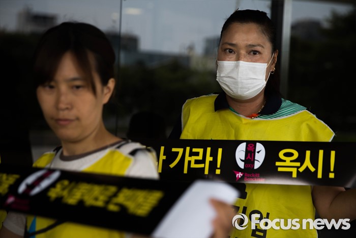 (서울=포커스뉴스) 23일 오전 서울 서초구 서울 중앙지검 앞에서 살균제 피해자와 가족모임 관계자들이 존 리 옥시 레킷벤키저 전 대표 검찰 소환조사를 기다리며 손 피켓을 들고 있다.
