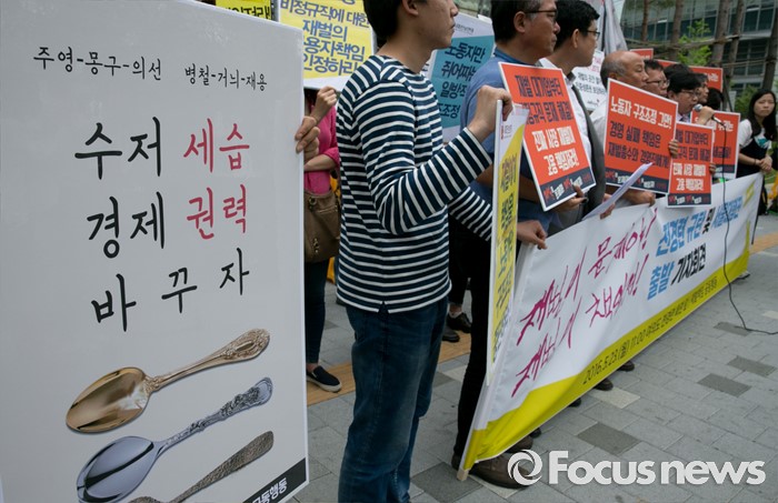 (서울=포커스뉴스) 23일 오전 서울 여의도 전국경제인연합회 앞에서 민주노총과 시민사회단체 등으로 구성된 재벌책임공동행동이 전경련 규탄 및 서울대행진 출발 기자회견을 하고 있다.