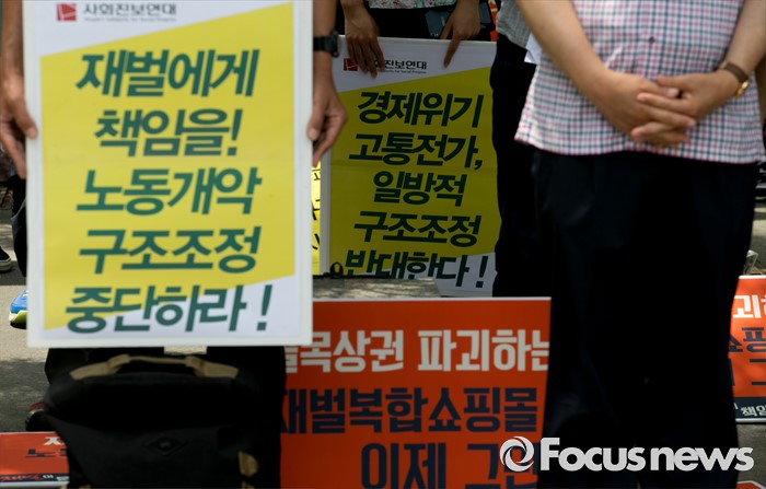 (서울=포커스뉴스) 23일 오후 서울 여의도 산업은행 본점 앞에서 민주노총과 시민사회단체 등으로 구성된 재벌책임공동행동이 규탄 및 서울대행진 출발 기자회견을 하고 있다.