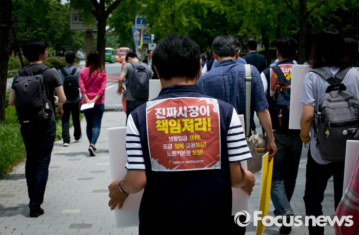 (서울=포커스뉴스) 23일 오전 서울 여의도 전국경제인연합회 앞에서 민주노총과 시민사회단체 등으로 구성된 재벌책임공동행동이 전경련 규탄 및 서울대행진 출발 기자회견을 마친 뒤 산업은행으로 이동하고 있다.
