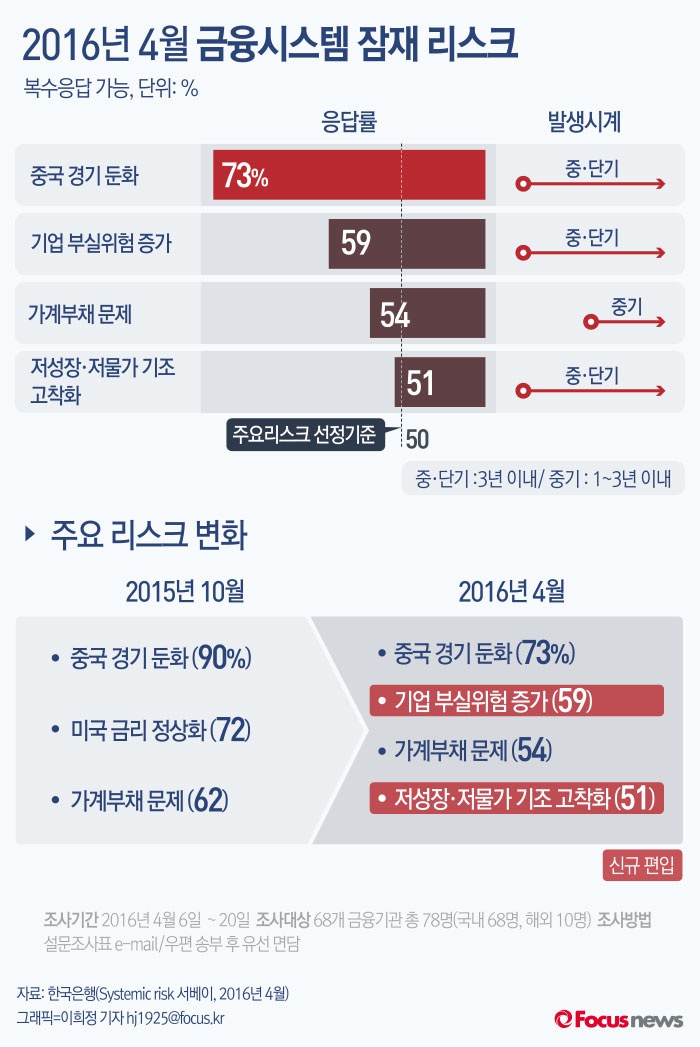 (서울=포커스뉴스) 23일 한국은행의 '구조적 위험(Systemic risk) 서베이'에 따르면 우리나라 금융시스템의 잠재적 위험 요인으로 중국 경기 둔화(73%), 기업 부실위험 증가(59%), 가계부채 문제(54%), 저성장·저물가 기조 고착화(51%) 등이 높은 응답 비율을 보였다.