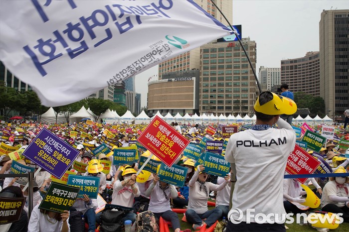 (서울=포커스뉴스) 23일 오후 서울 중구 시청광장에서 보육관계자들이 '어린이집 0~2세 맞춤형 보육제도 개선 및 시행 연기'를 촉구하며 결의대회를 하고 있다.