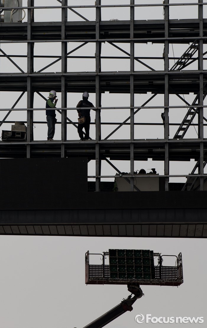 (서울=포커스뉴스) 23일 오후 서울 중구 태평로 프레스센터 옥외 전광판 위에서 관계자들이 보수 및 교체 작업을 하고 있다.