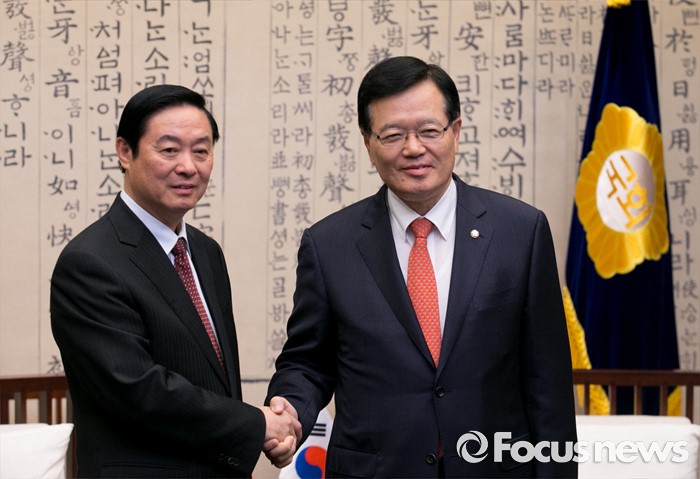 (서울=포커스뉴스) 싱크탱크 '새 한국의 비전'을 준비 중인 정의화(오른쪽) 국회의장이 23일 오후 서울 여의도 국회에서 류치바오 중국 공산당 중앙선전부장을 접견, 취재진을 향해 포즈를 취하고 있다. 정 의장은 지난 19일 본회의를 마친 뒤 유승민 무소속 의원과 독대한 것으로 알려져 관심을 모으고 있다.