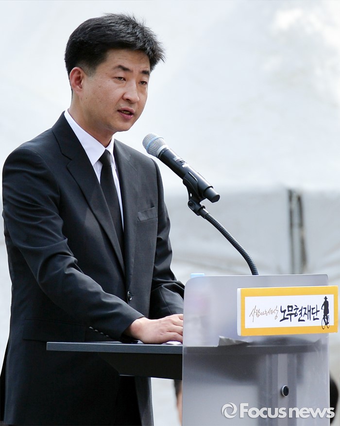 (김해=포커스뉴스) 23일 오후 경남 김해 봉하마을에서 엄수된 故 노무현 전 대통령 서거 7주기 추도식에 참석한 노 전 대통령 장남 건호 씨가 인사말을 하고 있다.