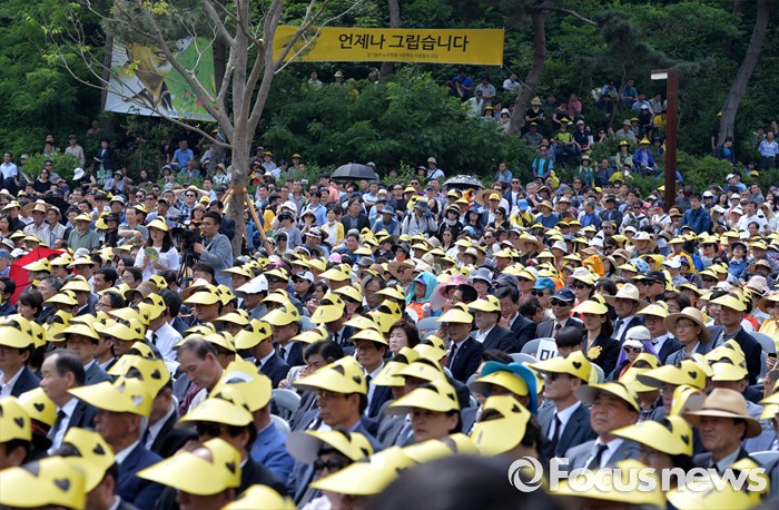 (김해=포커스뉴스) 23일 오후 경남 김해 봉하마을에서 엄수된 故 노무현 전 대통령 서거 7주기 추도식에 참석한 추도객들이 식을 지켜보고 있다.