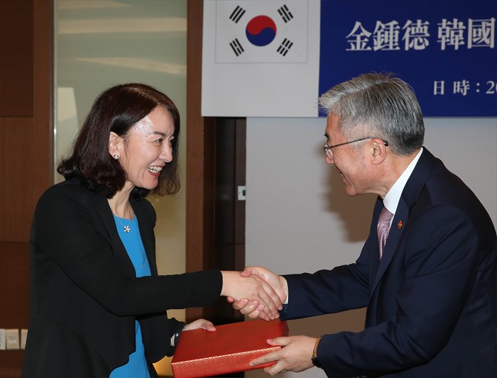 (서울=포커스뉴스) 23일 서울 중구 롯데호텔에서 문화체육관광부와 중국 국무원신문판공실이 주최하고21세기 한중교류협회가 주관하는 ‘제8차 한중 고위언론인 포럼’개회식이 열렸다. 김종덕(오른쪽) 문체부 장관이 중국 고위 언론인을 대표해서 노신녕 인민일보 부총편집장에게 선물을 주고 있다. <사진제공=문화체육관광부>