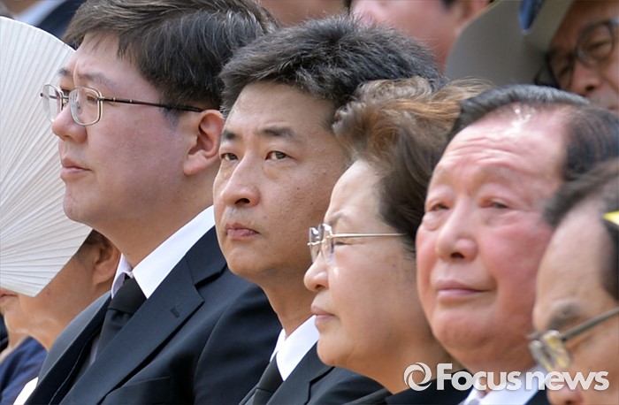 (김해=포커스뉴스) 23일 오후 경남 김해 봉하마을에서 엄수된 故 노무현 전 대통령 서거 7주기 추도식에 참석한 인사들이 추도식을 지켜보고 있다. 앞줄 왼쪽부터 김홍걸 더불어민주당 국민통합위원장, 노 전 대통령 장남 건호 씨, 부인 권양숙 여사, 김원기 전 국회의장.