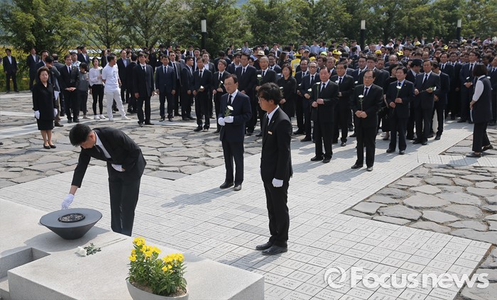 (김해=포커스뉴스) 23일 오후 경남 김해 봉하마을에서 엄수된 故 노무현 전 대통령 서거 7주기 추도식을 마친 뒤 노 전 대통령 부인 권양숙 여사와 장남 건호 씨 등 참석자들이 묘역 참배 및 헌화를 하고 있다.
