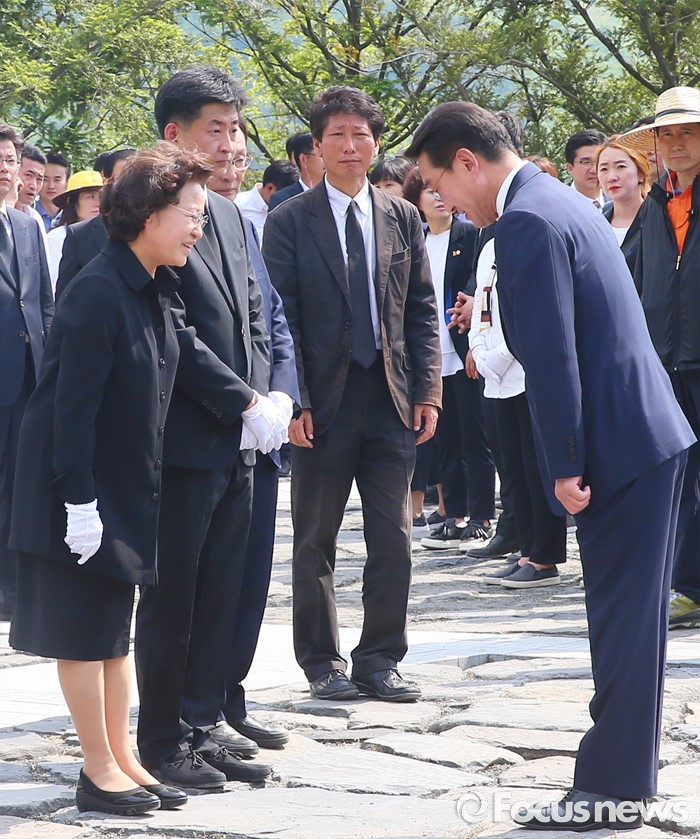 (김해=포커스뉴스) 23일 오후 경남 김해 봉하마을에서 엄수된 故 노무현 전 대통령 서거 7주기 추도식을 마친 뒤 현기환(오른쪽) 청와대 정무수석이 묘역 참배 및 헌화한 뒤 노 전 대통령 부인 권양숙(왼쪽) 여사, 장남 건호 씨와 인사하고 있다.